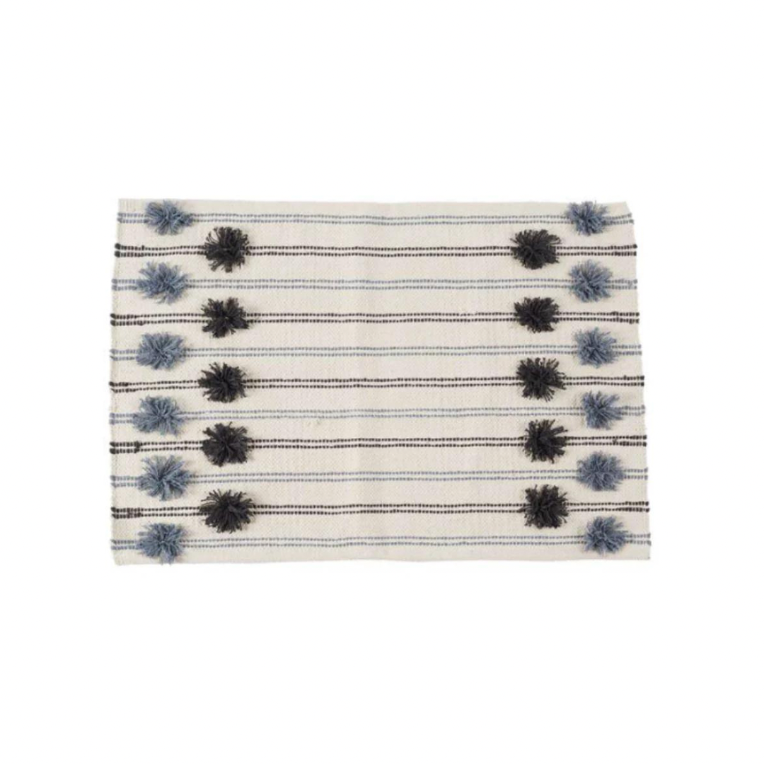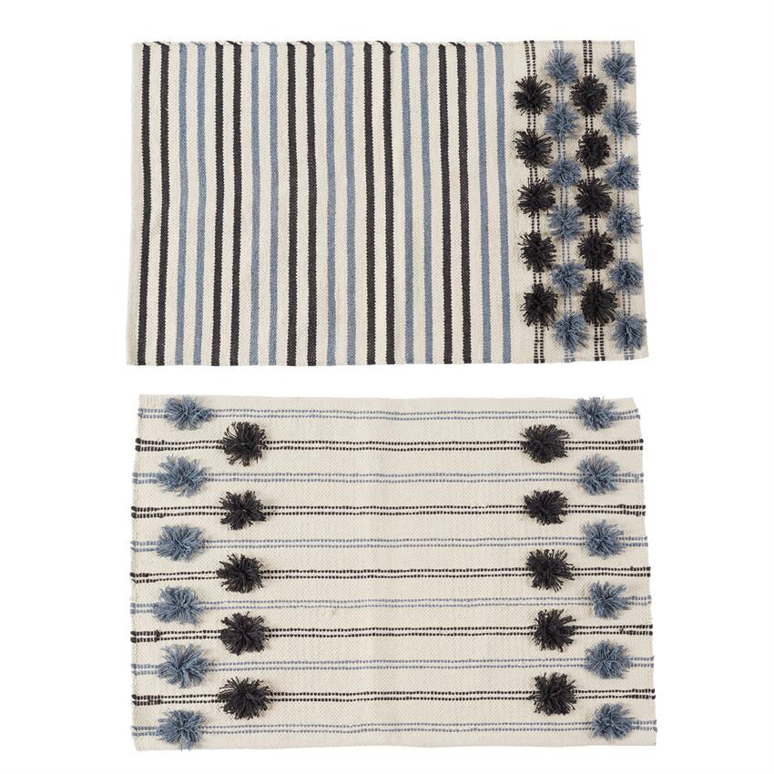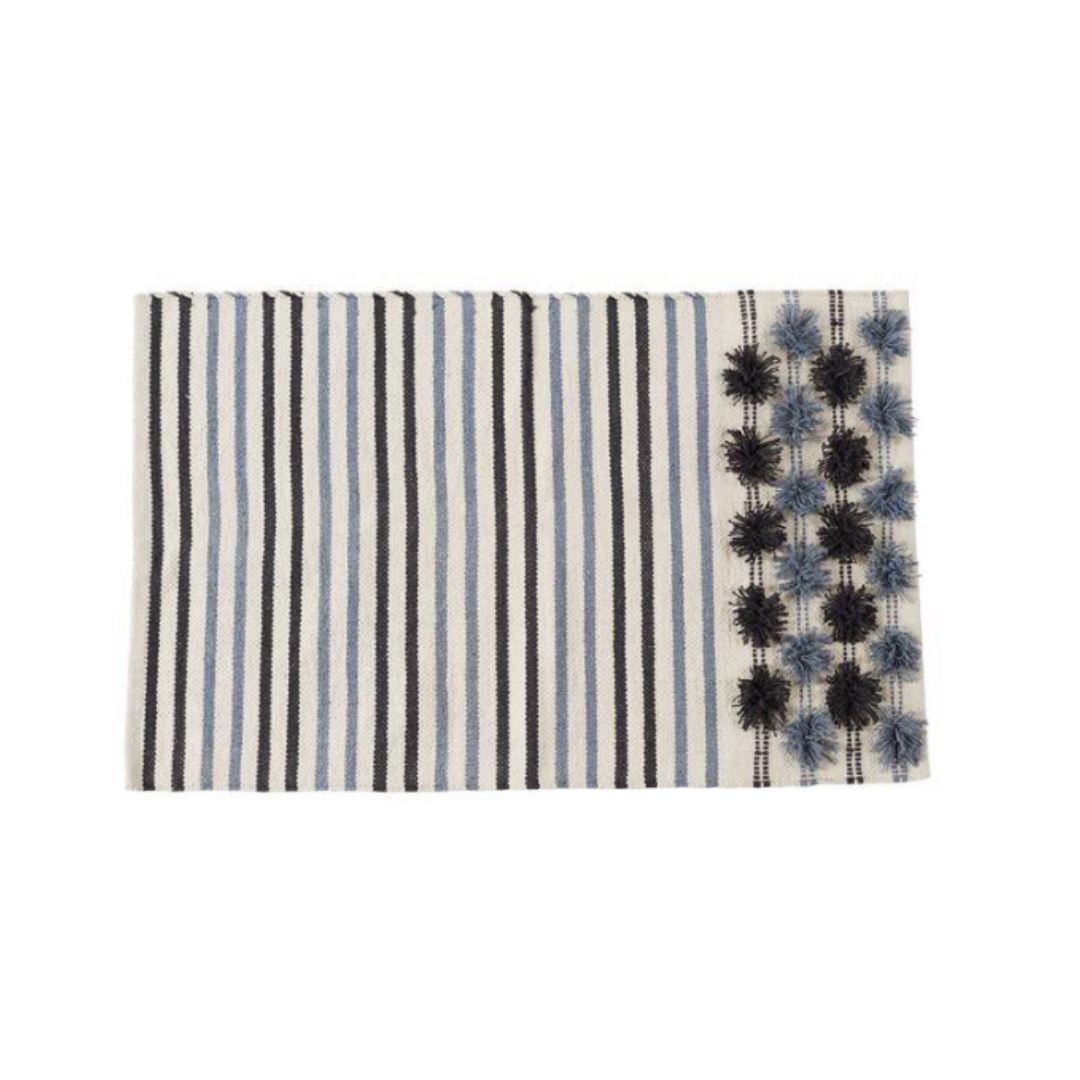 These 100% cotton throw rugs feature embroidered blue stripes and fringe pom-pom detail. Available in 2 styles.