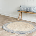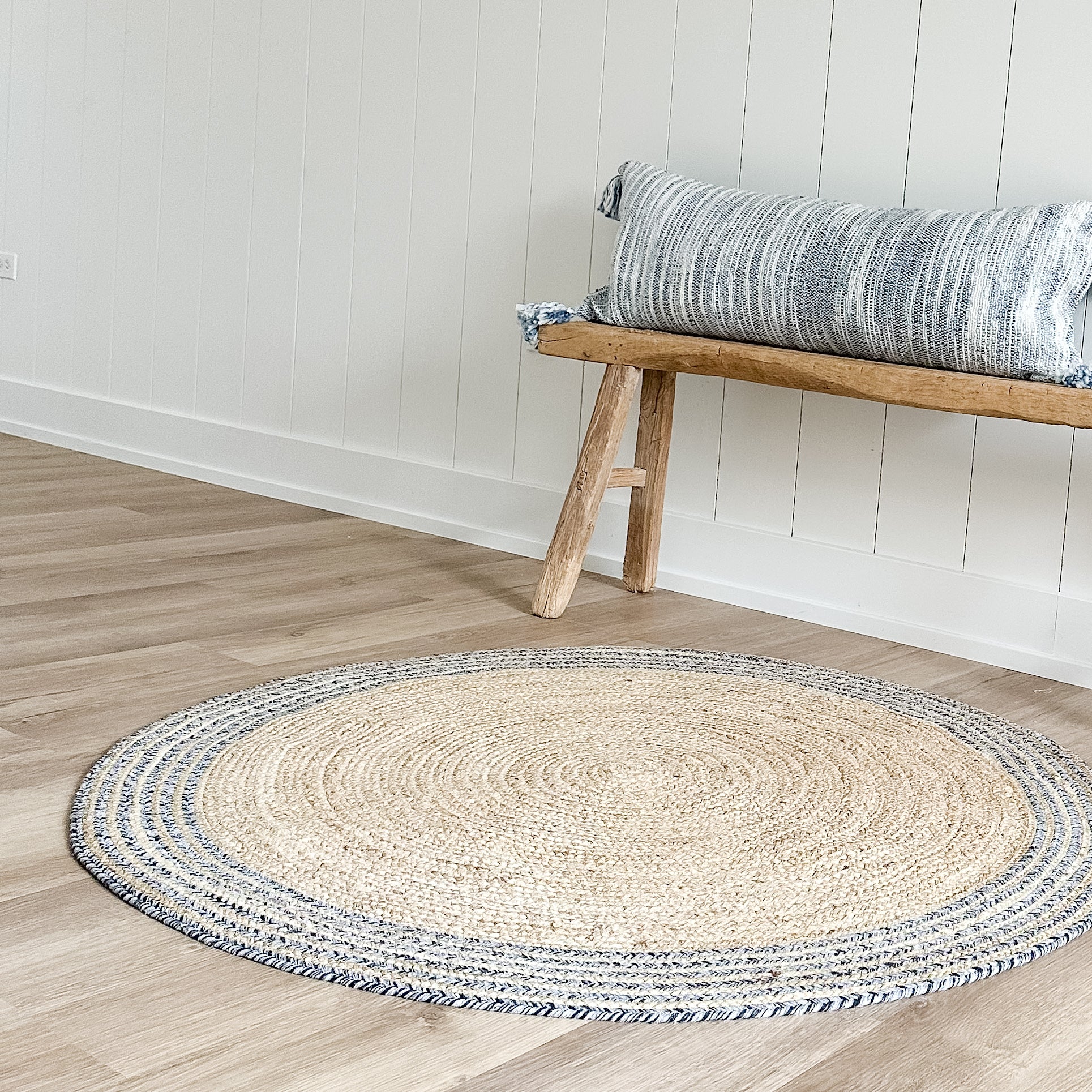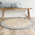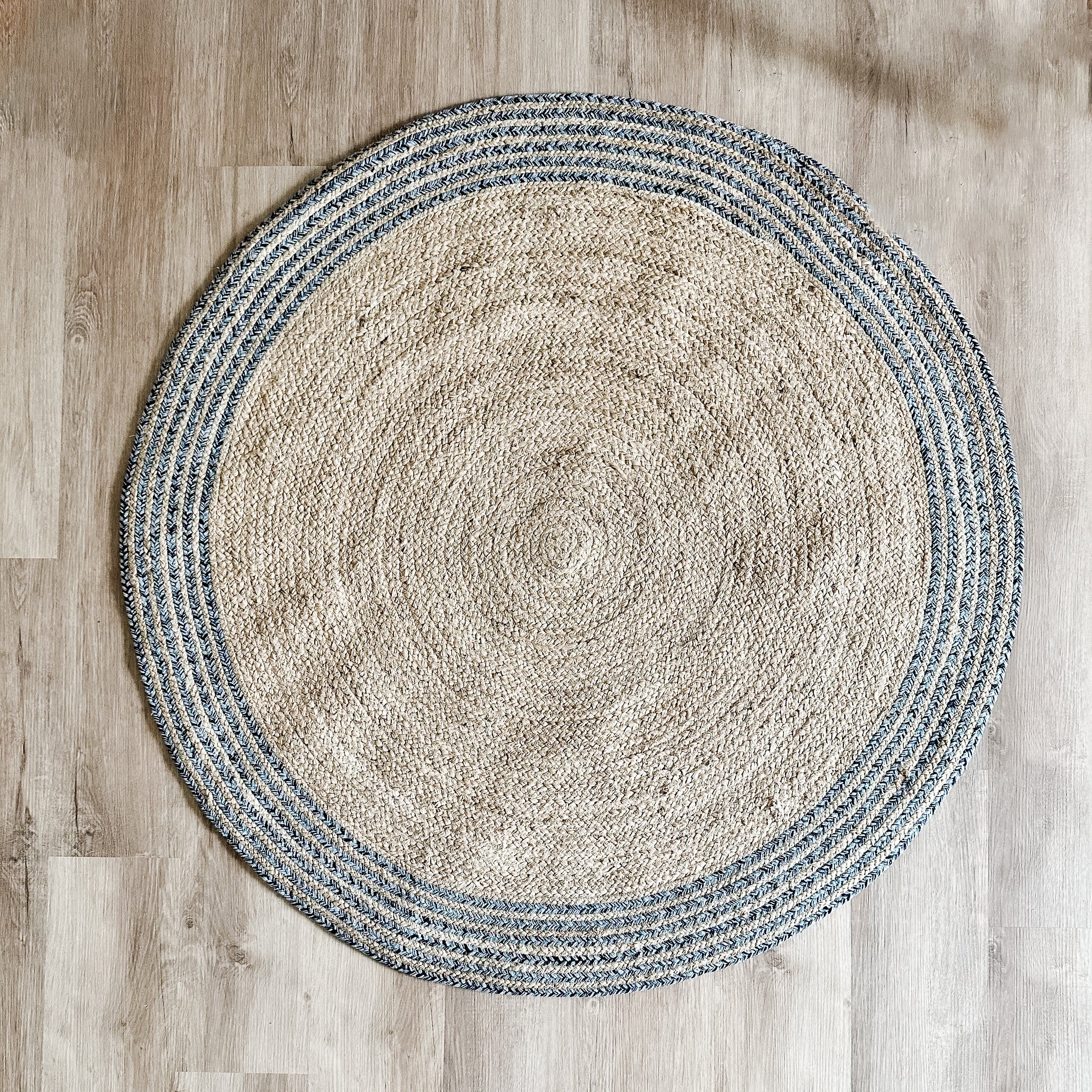 Our Round Cape Cod Rug is made of soft, hand loomed natural fibers and features a blue stripe border.
