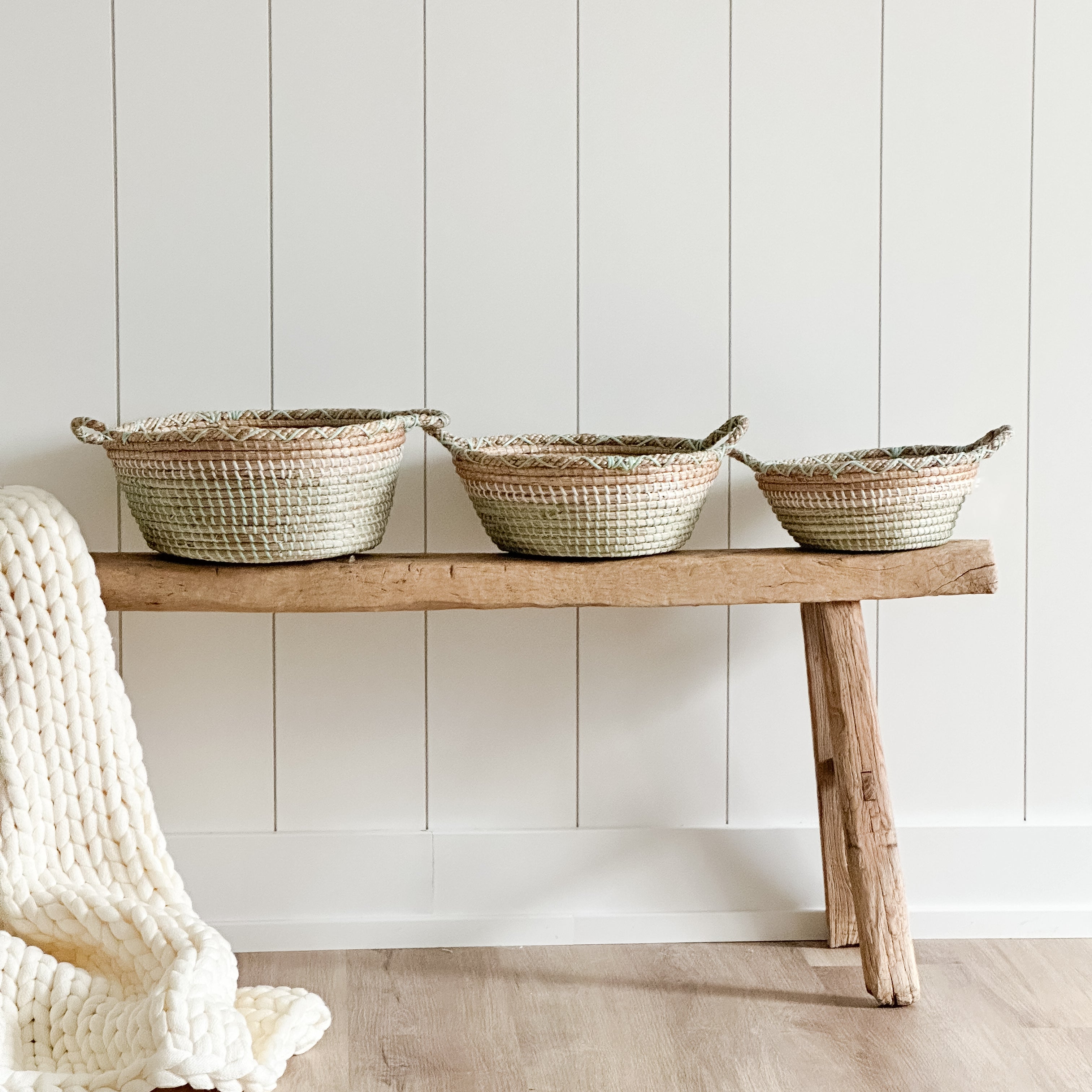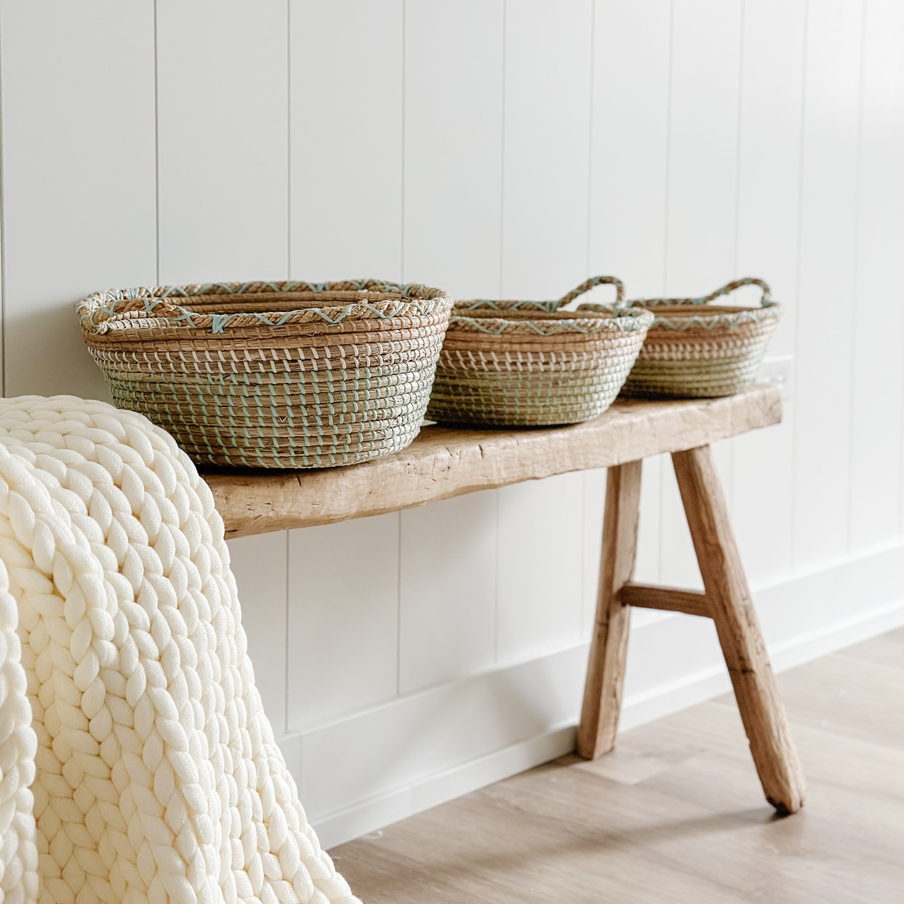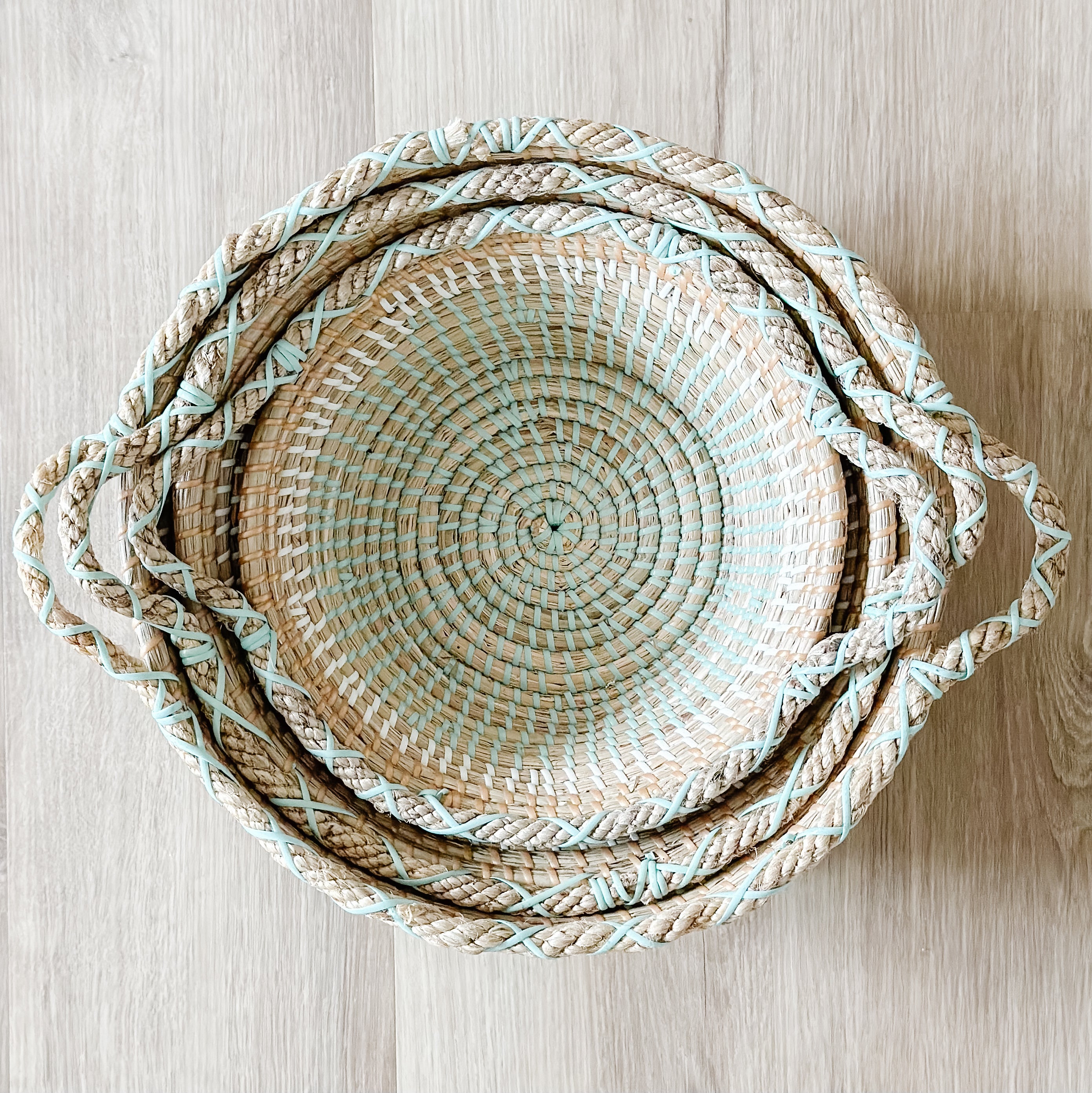 Our Seagrass Nesting Baskets are made of hand woven seagrass with a mint green and white accent. Sold as a set of 3.