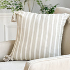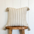 Our Linen Stripe Pillow Cover is made of a linen/cotton blend in a beige and white stripe pattern with tasseled corners.