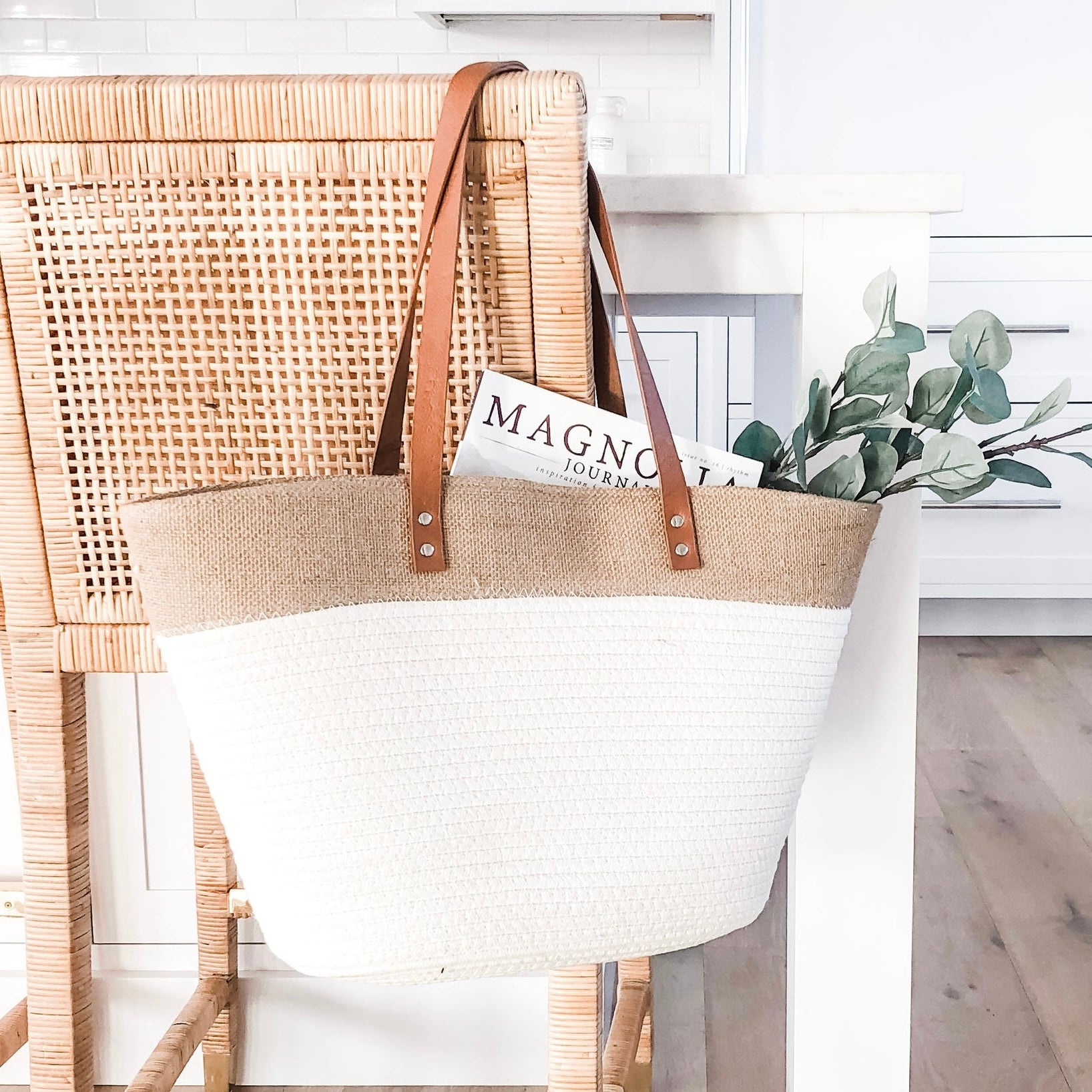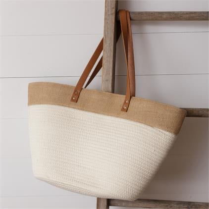 This Two Toned Tote Bag is one of our best selling bags! It features a cotton rope base with jute accent and leather handles.