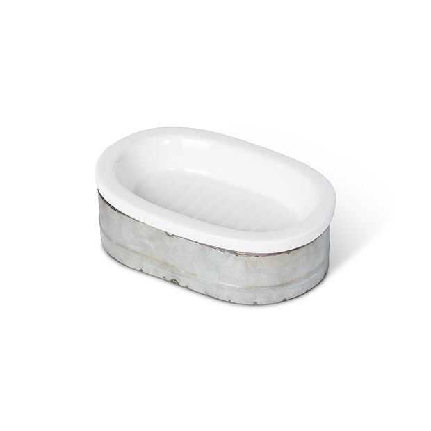 This farmhouse style soap dish features a porcelain dish set in a metal tub.