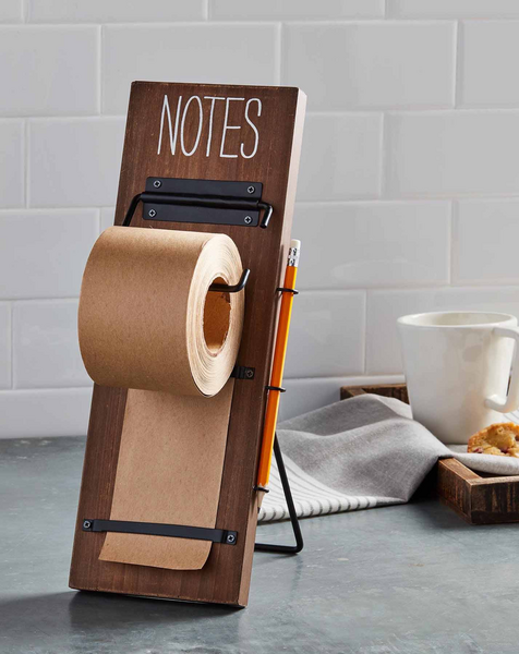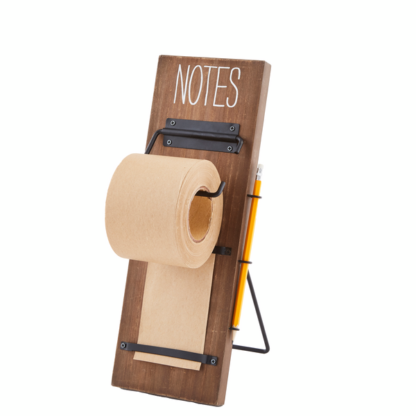 This Notepad Roller will become your favorite household item. The two piece set comes with a printed wood note plaque. It can be used in two ways - it can hang with saw tooth backing or stand with back easel. Pencil and paper roll included.