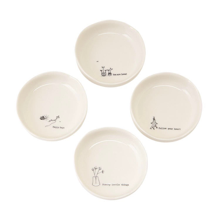 These adorable trinket dishes are made of porcelain and feature a choice of 4 different sweet sayings. Sold individually.