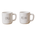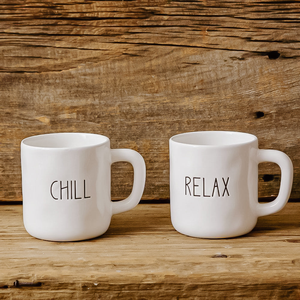 Chill & Relax Mugs, perfect for your morning coffee or sipping cocoa by the fire on a fall evening. Makes a great gift! Sold in a set of two, one of each style.