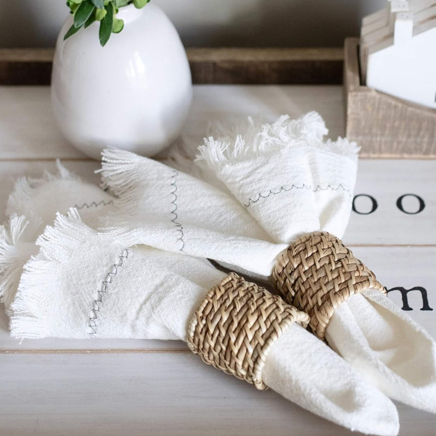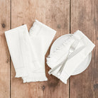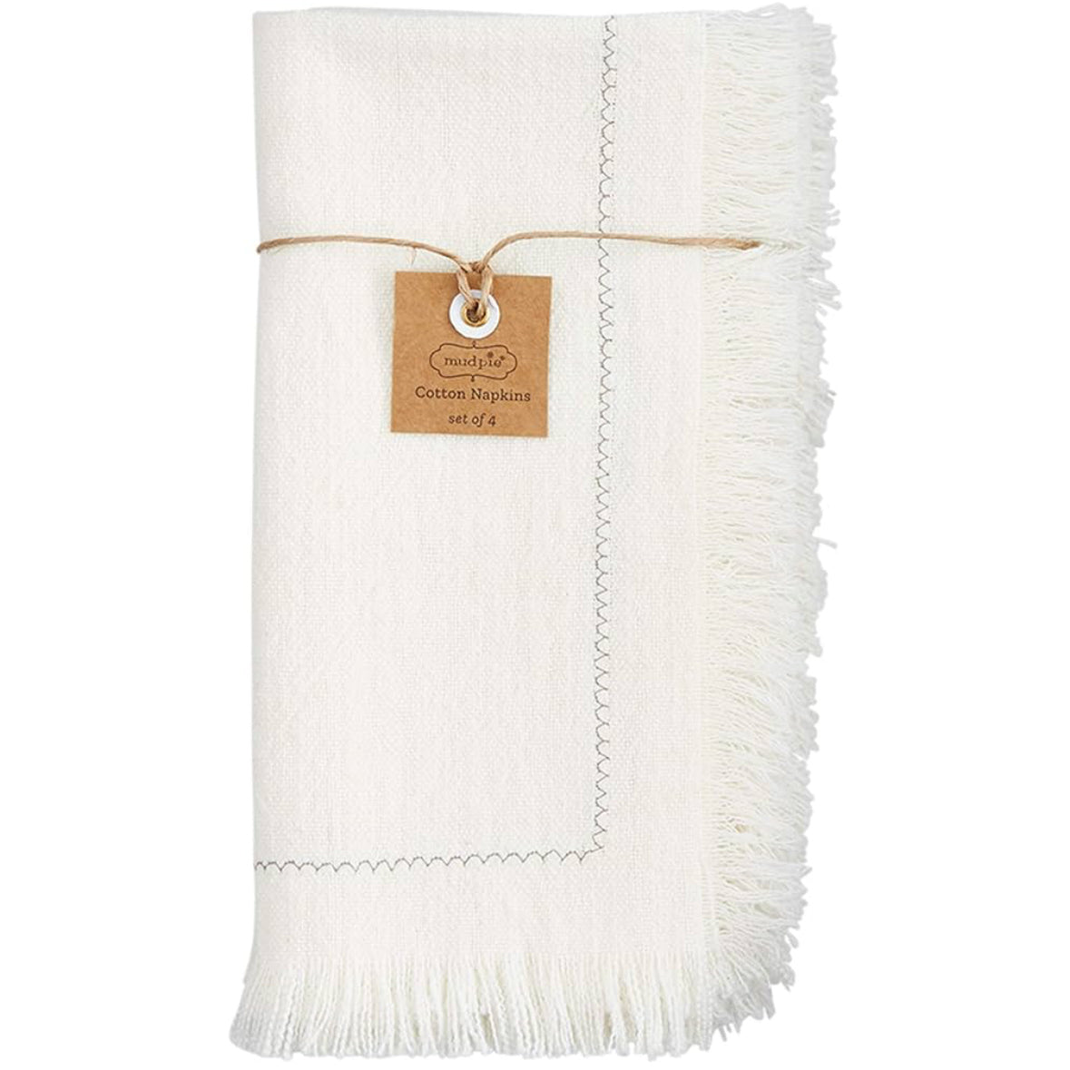 Our white cotton napkins feature a subtle gray embroidered accent and fringed border. Sold in a set of 4.