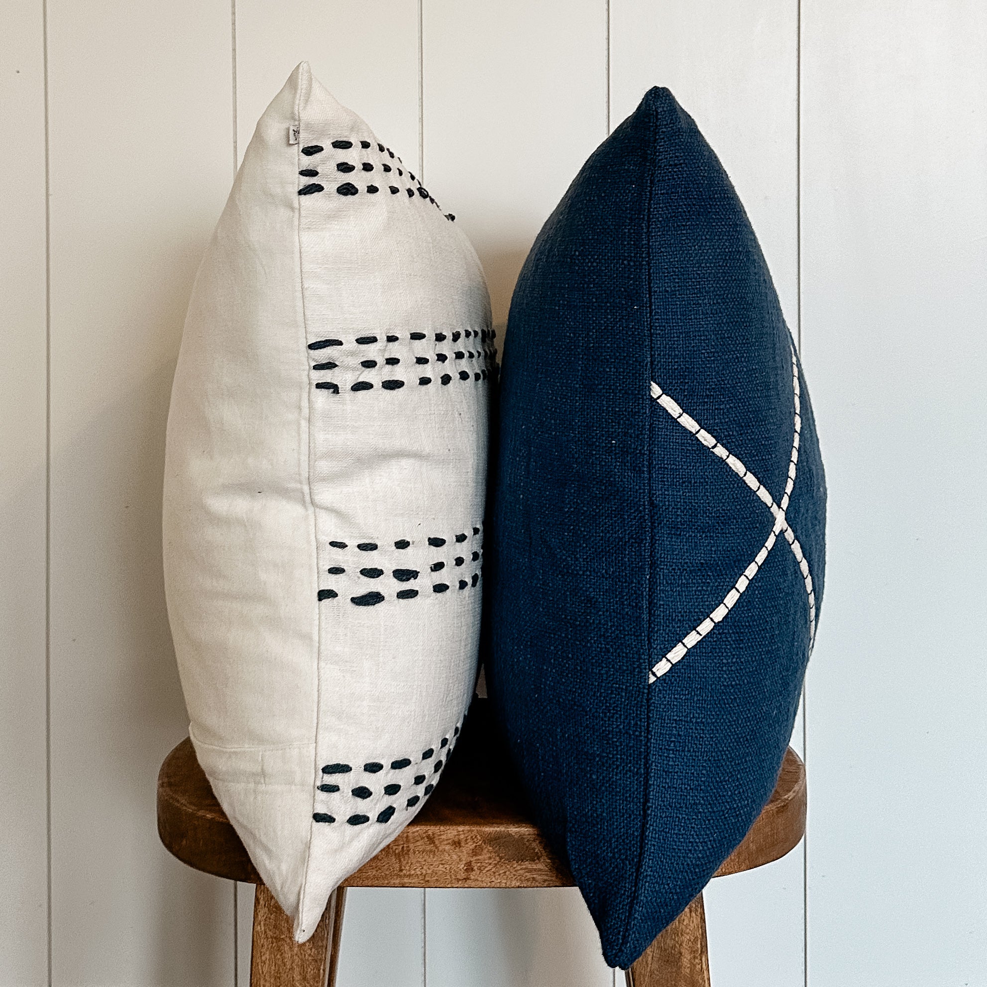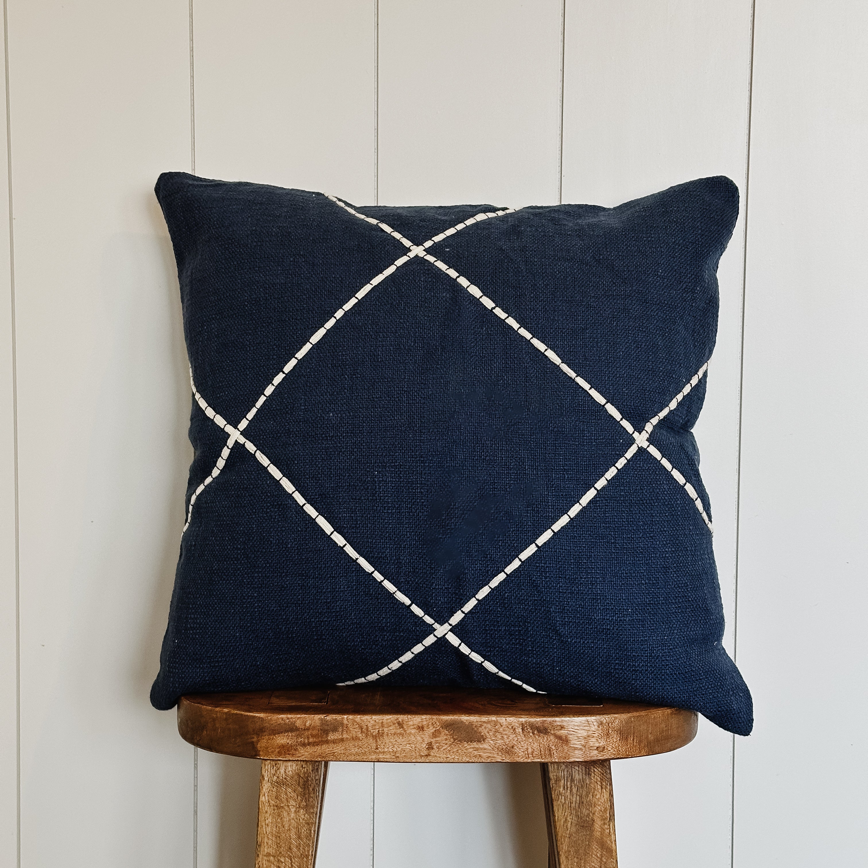 Our Lattice Stitch Pillow is made of navy blue cotton with white embroidered criss cross detail and hidden zipper closure.