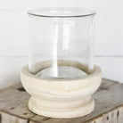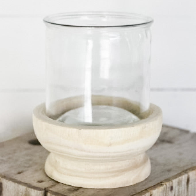 Our Paulownia Wood Candle Stand features a carved paulownia wood pillar base with cylindrical shaped glass.