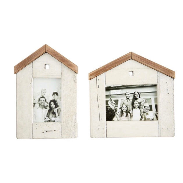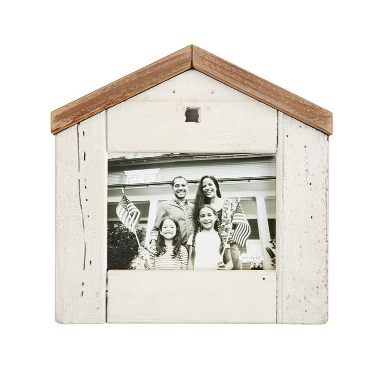 Our Wooden House Frames are crafted of white-washed reclaimed wood and shaped with natural wood roof. Holds 4" x 6" or 5" x 7" photo. Sold separately.