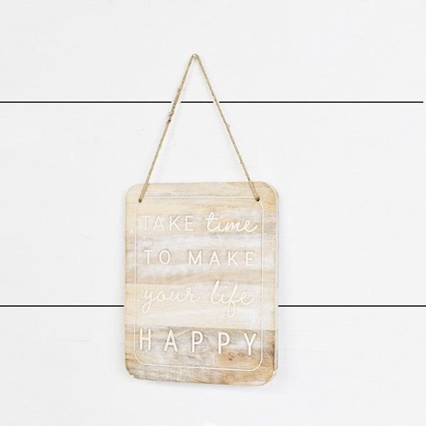 Our Take Time To Make Your Life Happy Sign is crafted of solid wood and features an engraved sweet sentiment and jute rope hanger.