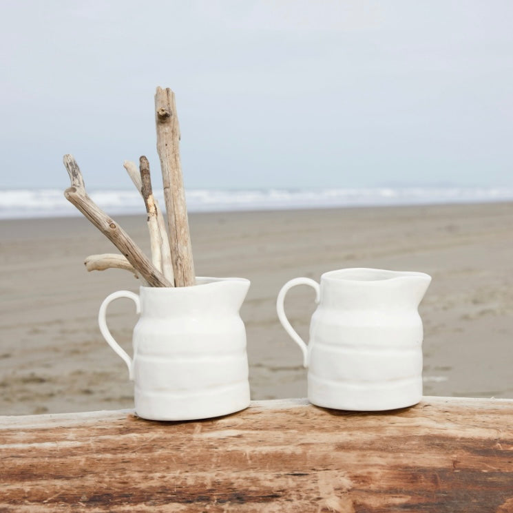 Our Stoneware Mini Pitcher features a textured, glossy white finish and makes a perfect kitchen accent. Looks beautiful as a bud vase or for serving creamer, syrup, etc. This item is food safe.