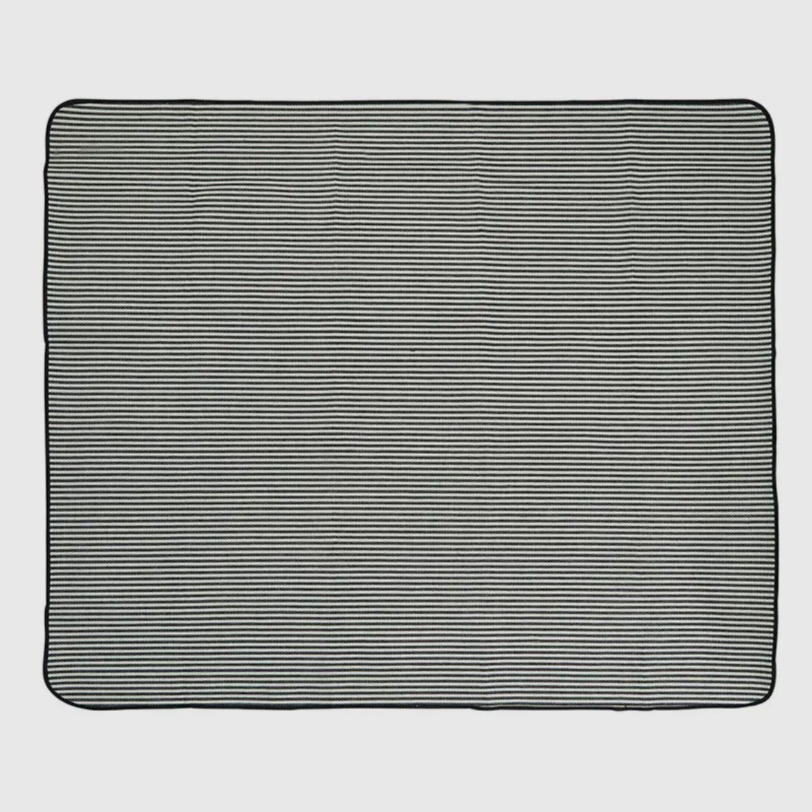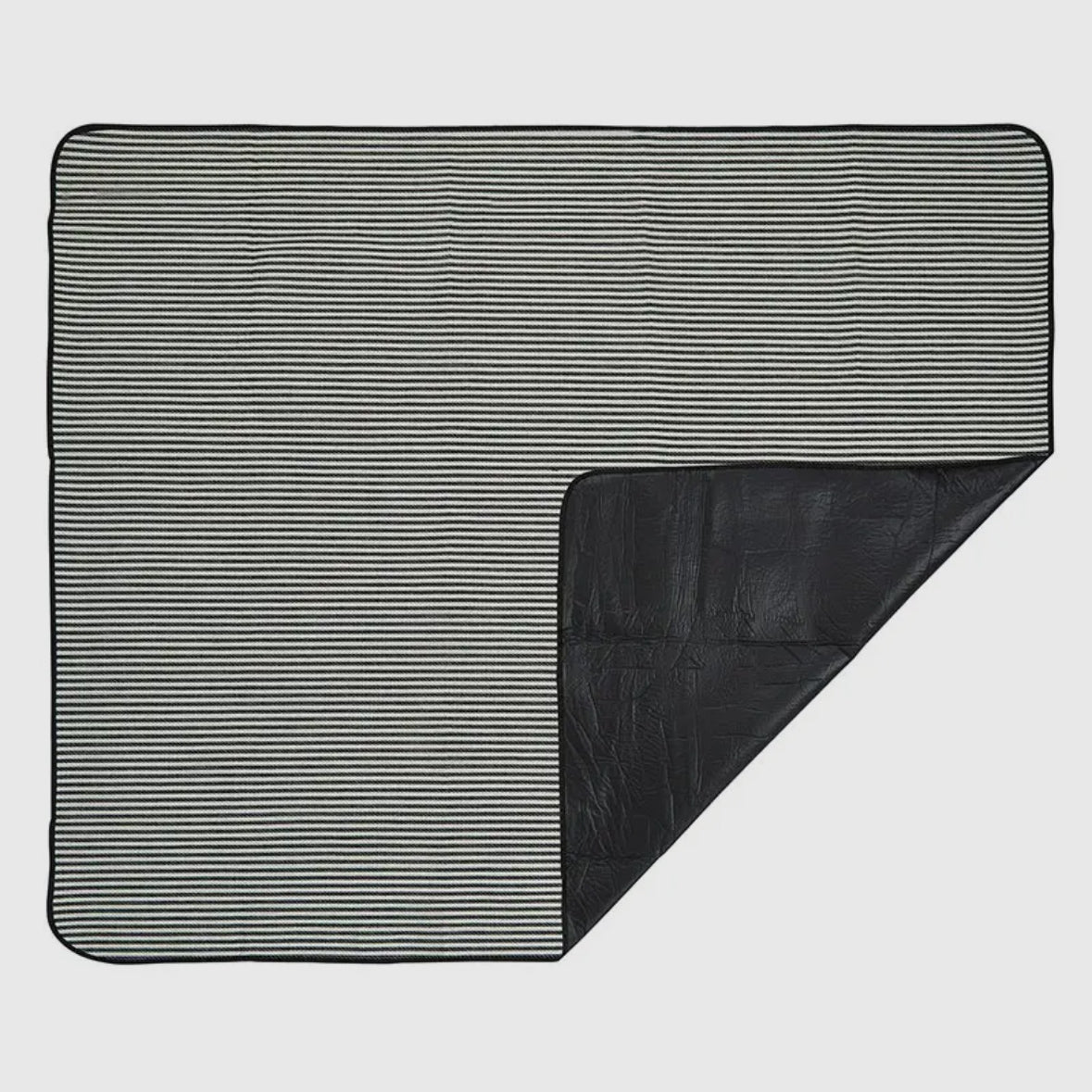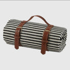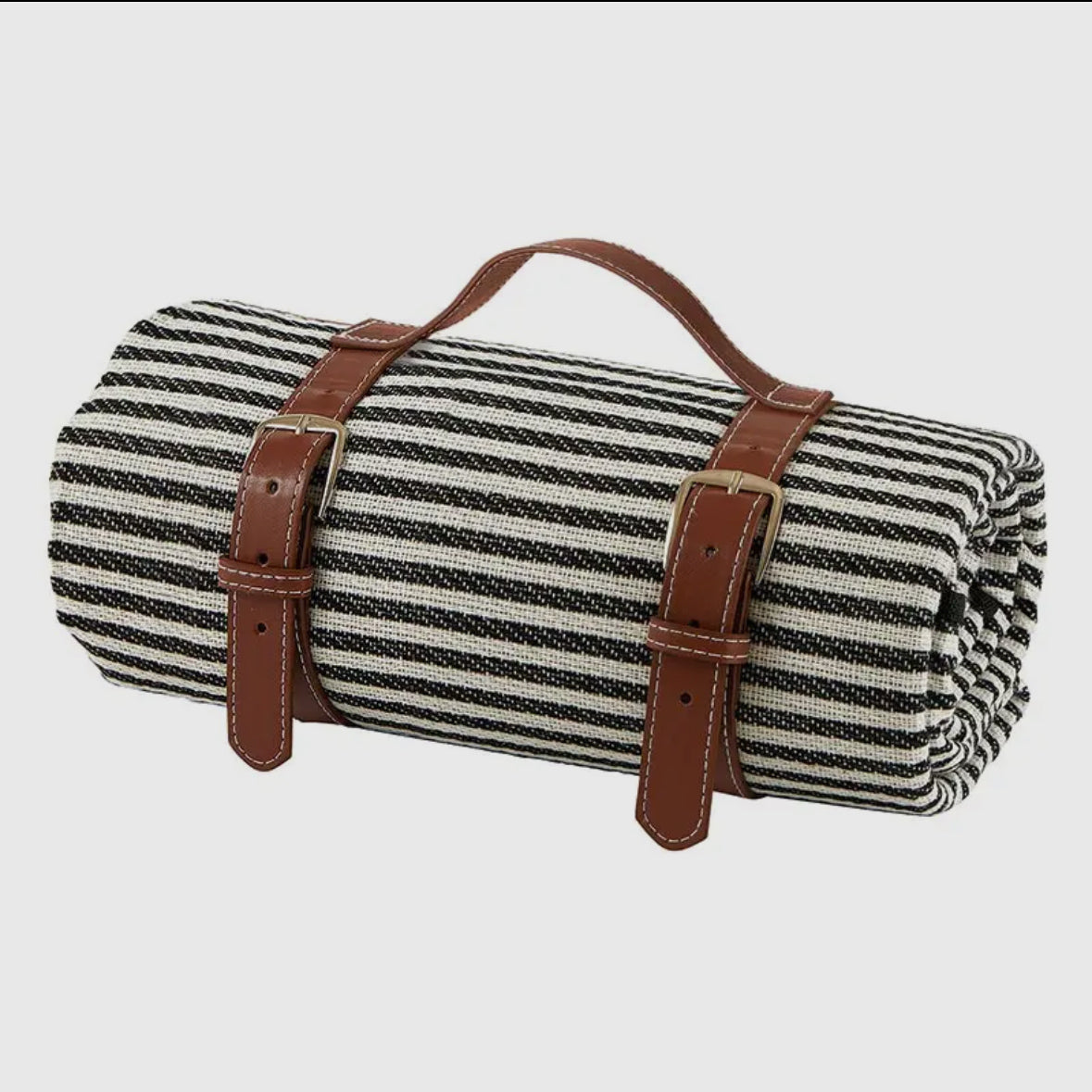 Fun black and white stripe blanket is perfect for al fresco dining, outdoor lounging or watching a sporting event. Roll up, carry and store easily with PU leather straps and handle.