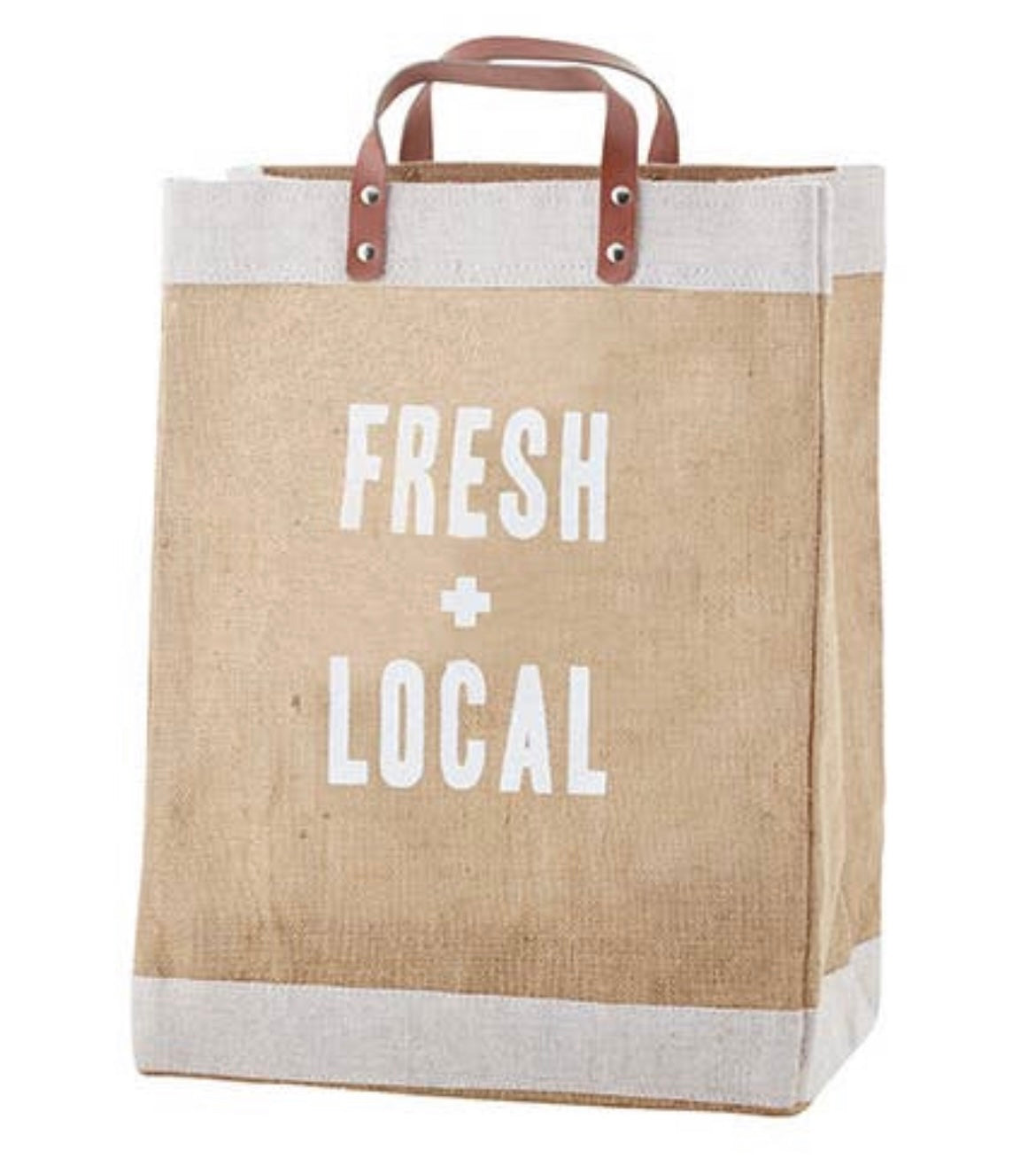 Our Fresh + Local Market Tote Bag is made of jute with genuine leather handles and features a durable waterproof lining. The perfect accessory for a trip to the local grocery or farmer’s market!