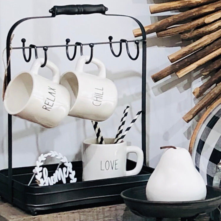 Create a your own coffee bar with this tabletop mug rack! Features 6 hooks, carrying handle and attached tray. Made of metal with antique black finish.